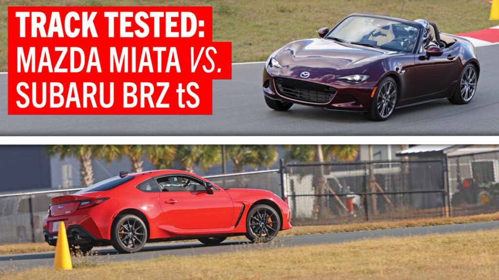 Nors abu automobilius išbandėme ant šviežio, lygaus „Circuit Florida“ asfalto – naujoje, sudėtingoje trasoje, esančioje į vakarus nuo Orlando – ši puiki danga ir su ja susijęs nuspėjamumas niekaip nekompensuoja „Miata“ galios trūkumo. „Mazda“ taip pat atsisako šiek tiek sukibimo: ji dėvi 215 mm „Bridgestone Potenza S001“ padangas, o „Subaru“ – 225 mm „Michelin Pilot Sport 4“ gumą.
